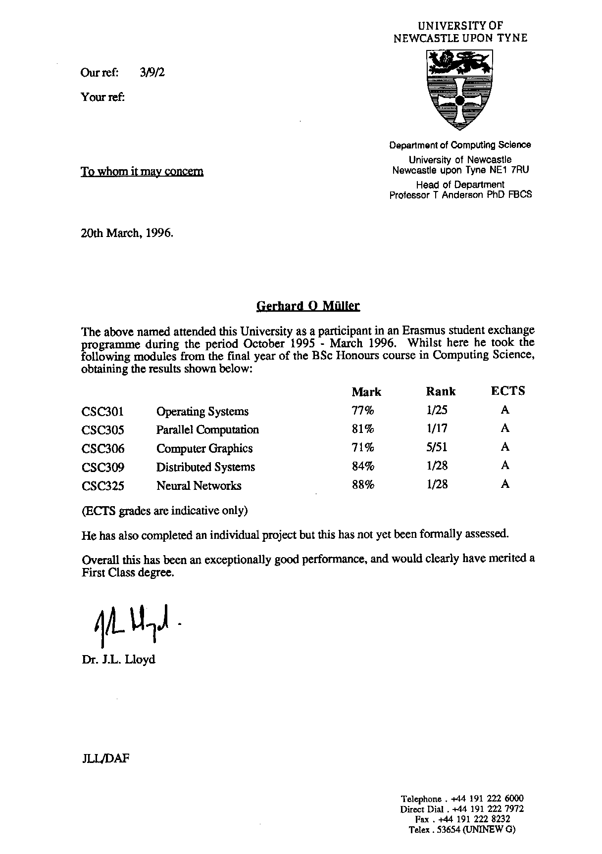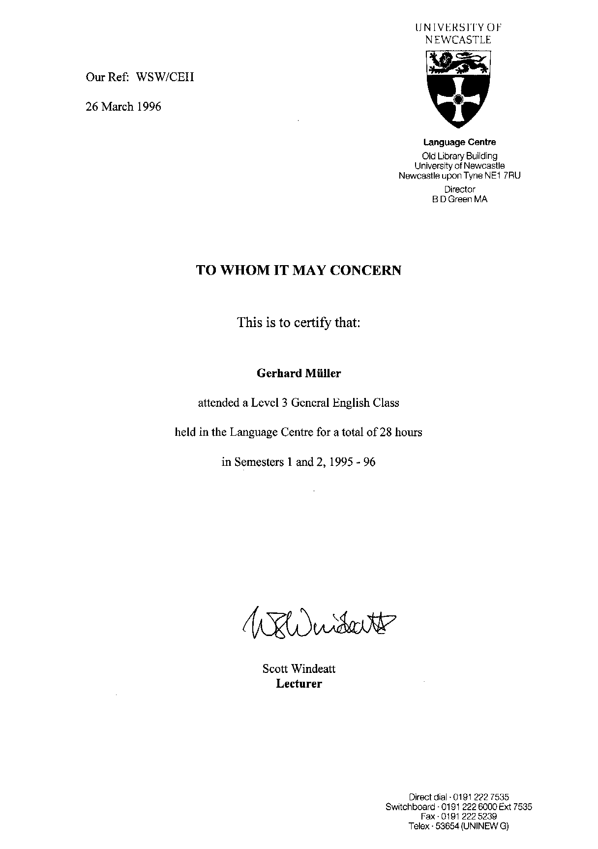 Ich habe zwischen 1. Oktober 1995 und 31. März 1996 in Newcastle upon Tyne, England, studiert.